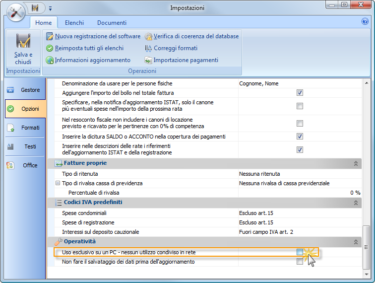 Dopo aver configurato la condivisione del programma in rete dovete togliere la spunta alla seguente opzione che trovate nella scheda Opzioni delle Impostazioni.