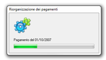 Questa funzione permette di riorganizzare i pagamenti in ordine cronologico ed è essenziale di fronte ad errori nei saldi o per correggere le date valuta nel caso le modifiche alle rate o ai pagamenti non siano state fatte in ordine cronologico. Se si è sicuri di voler riorganizzare tutti i pagamenti, si clicca su Sì per procedere. La procedura dura qualche minuto e l'avanzamento è visualizzato come illustrato.